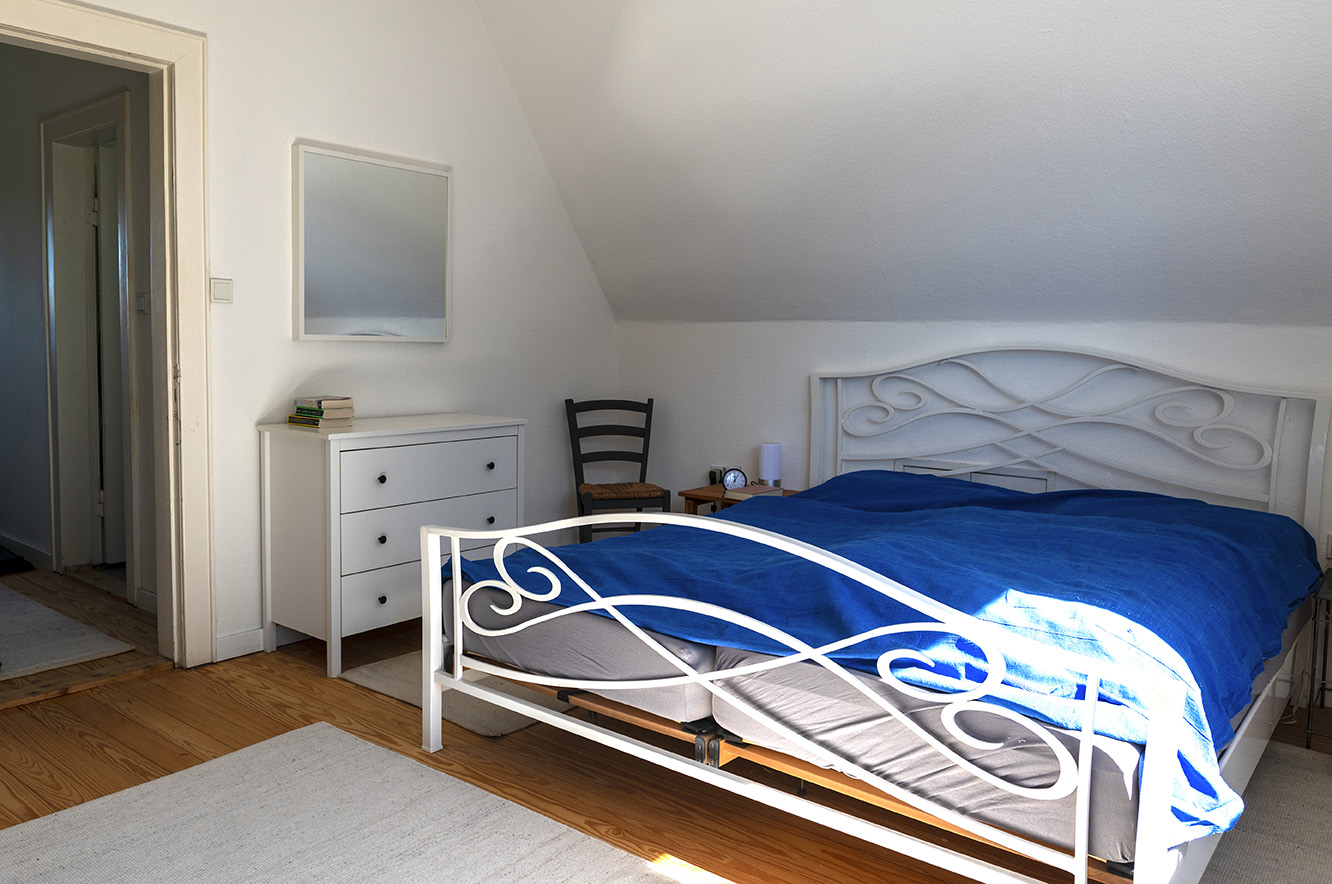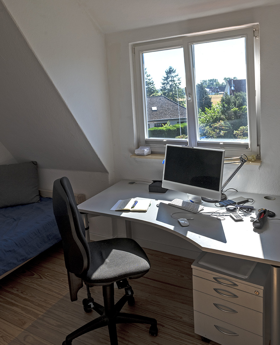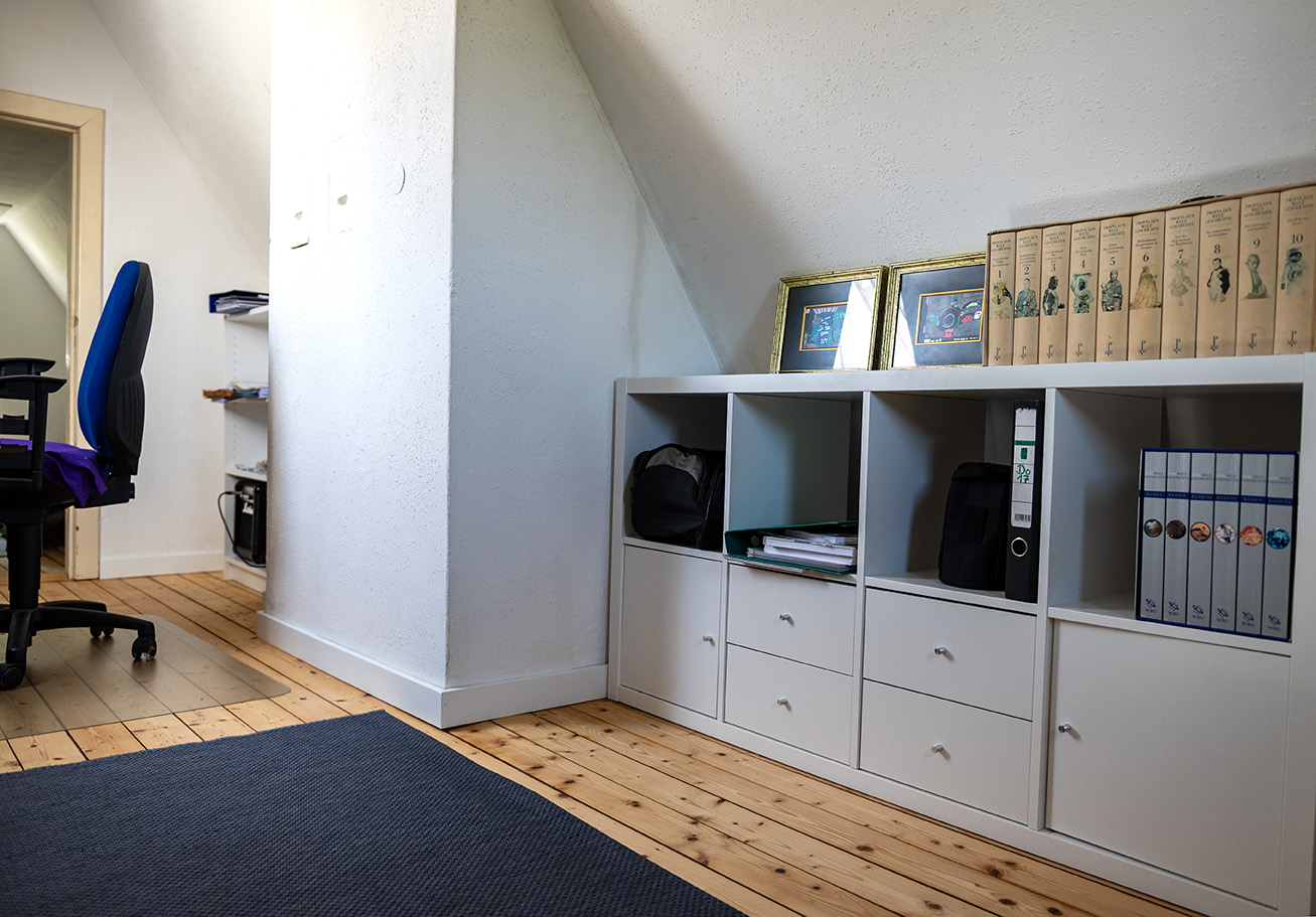 Das Dachgeschoss wurde zu einem geräumigen Studio ausgebaut, dass durch eine Trennwand in zwei Bereiche getrennt ist (aktuelle Arbeitszimmer und Gästebereich).