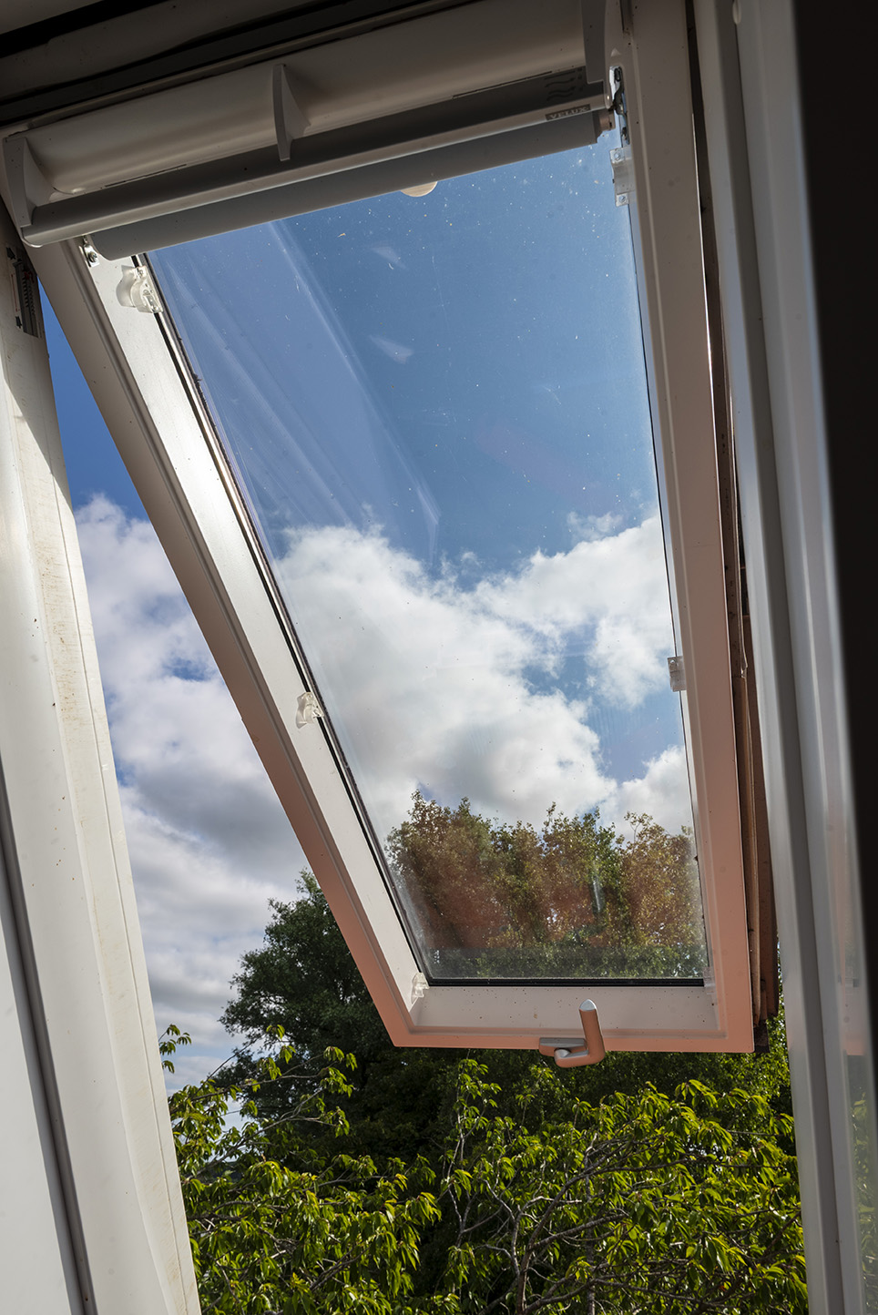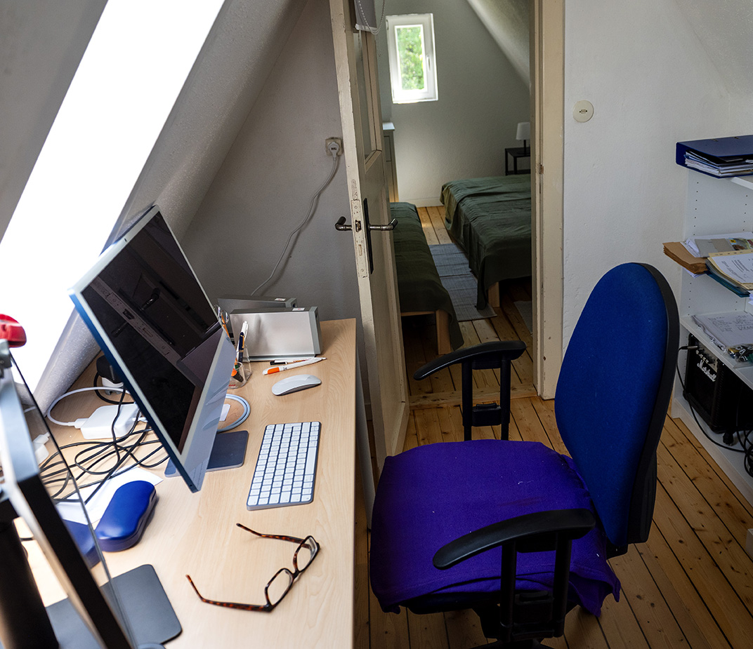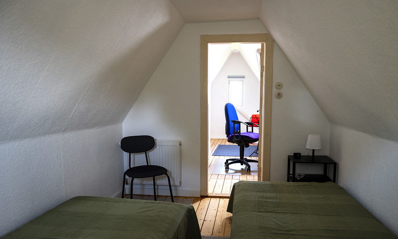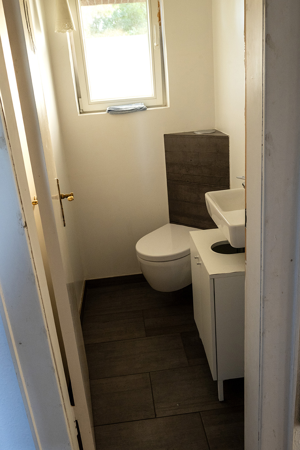 Das Dachgeschoss wurde zu einem geräumigen Studio ausgebaut, dass durch eine Trennwand in zwei Bereiche getrennt ist (aktuelle Arbeitszimmer und Gästebereich).