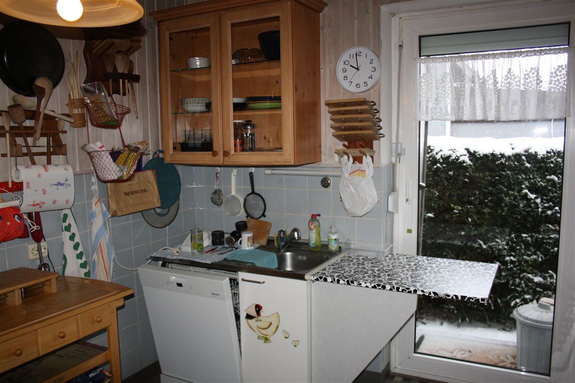 40 m² großes Wohn/-Esszimmer mit Kaminofen und Zugang zur Terrasse, Küche, Schlafzimmer( zur Zeit Saunaraum), Wannenbad und Gäste WC im Erdgeschoss.